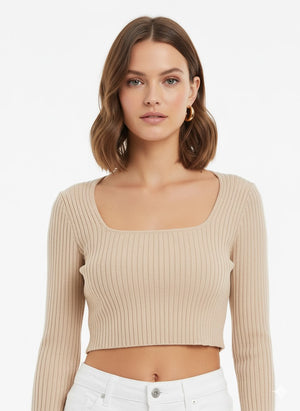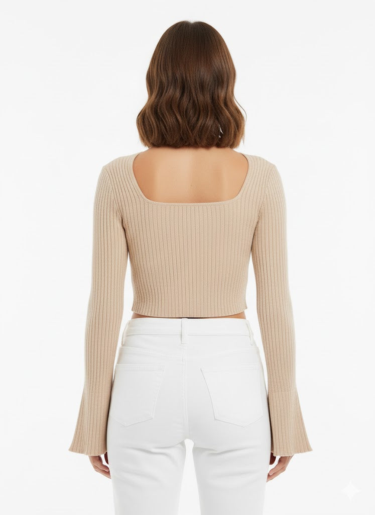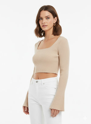 Elevate your everyday look with the ultimate blend of comfort and style. This stunning ribbed knit crop top features a flattering square neckline and trendy, dramatically flared bell sleeves. The luxurious, soft fabric hugs your figure perfectly, making it an essential piece for year-round styling. Pair it with high-waisted denim for an instantly chic, polished outfit.