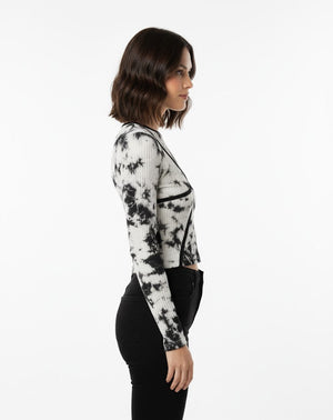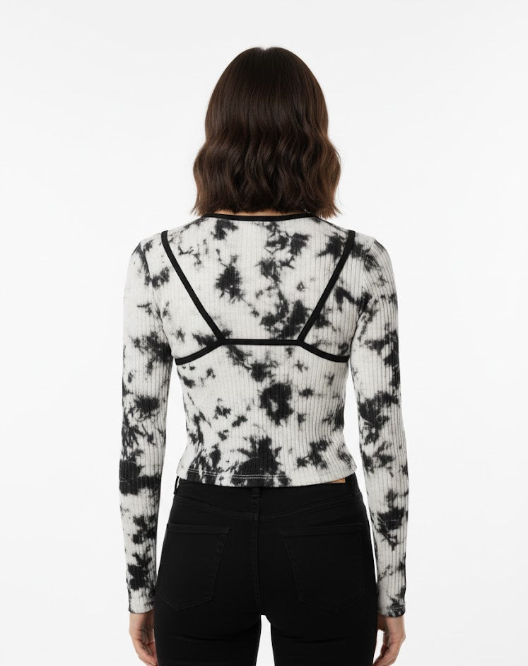 Make a bold statement with this black and white tie-dye ribbed top featuring contrast black stitching for a modern edge. Its slim fit and soft fabric create a sleek, flattering look perfect for casual outings or nights out.