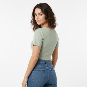 - Fit: Form-fitting, cropped silhouette with short sleeves.