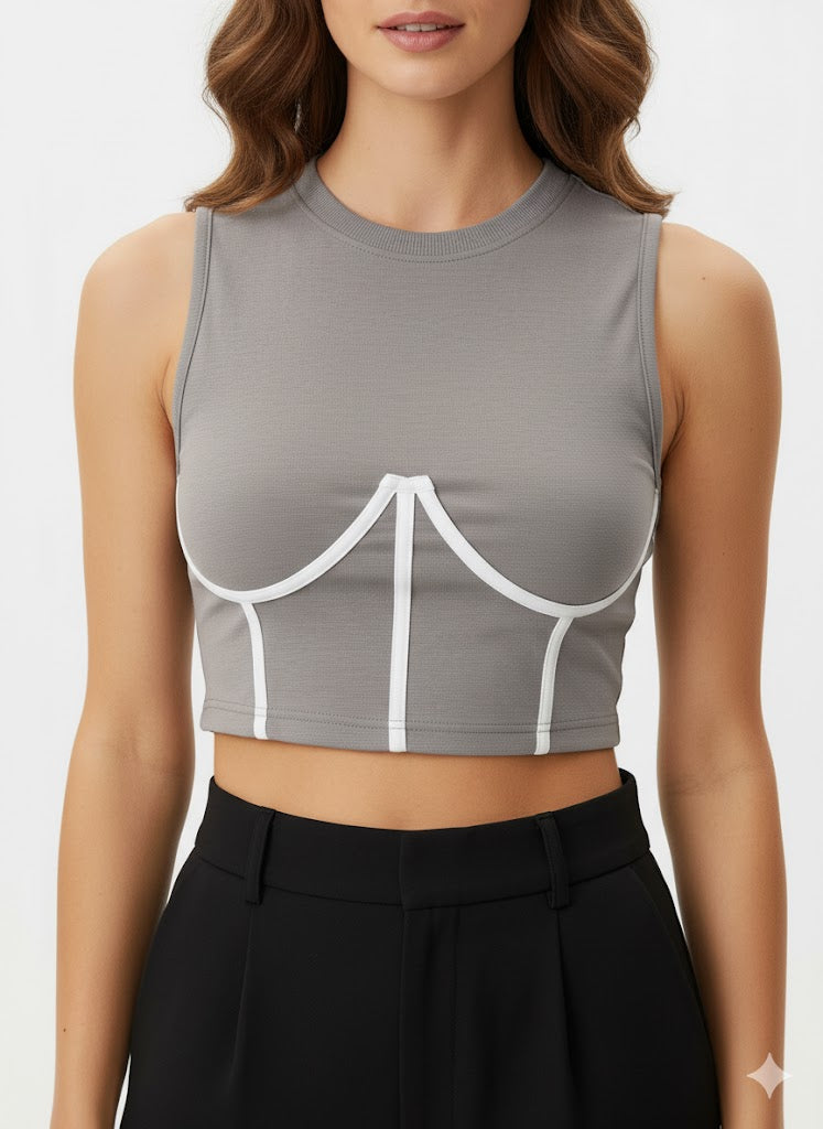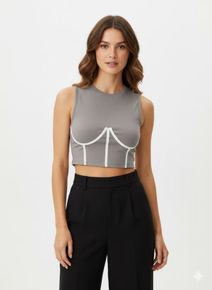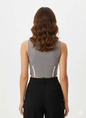 Elevate your street style with this sporty-chic sleeveless top. The cool grey fabric is highlighted by bold white underbust detailing, giving it a dynamic, athletic edge. Designed with a high crew neck and a fitted cut, it seamlessly transitions from daytime casual to evening cool.