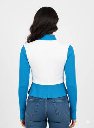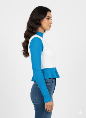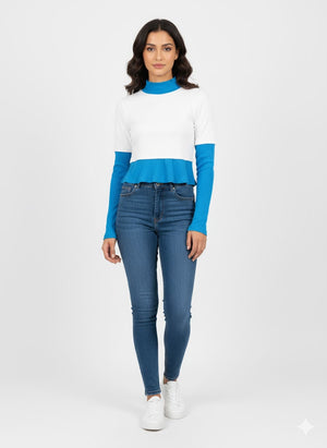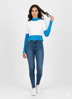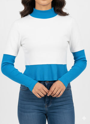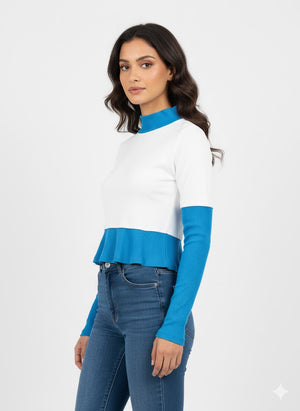 Product Description: Upgrade your casual rotation with this cozy and cute layered-effect tee. This top blends the ease of a t-shirt with the warmth of a light sweater, featuring a white short-sleeve bodice layered over blue long ribbed sleeves and a matching turtleneck.