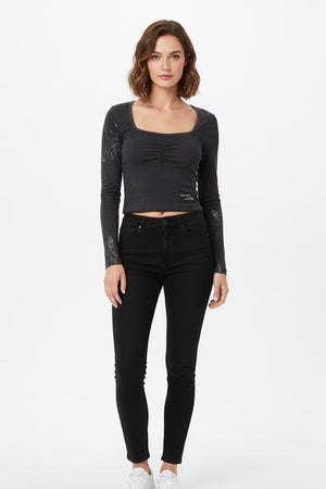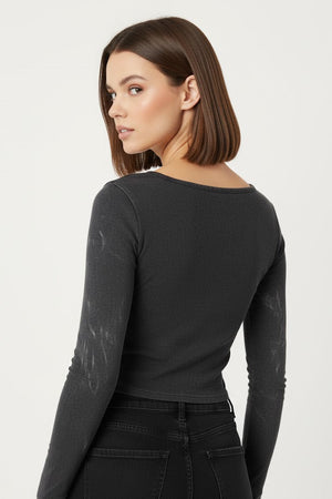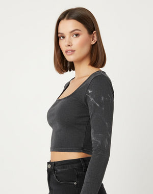 Inject some edgy appeal into your wardrobe with our Distressed Square Neck Crop Tee. This long-sleeve tee features a distinctive, slightly faded charcoal wash that gives it a cool, worn-in look. The square neckline and delicate central ruching detail create a beautiful, feminine silhouette, contrasting perfectly with the top's distressed finish.
