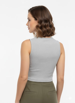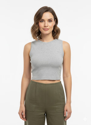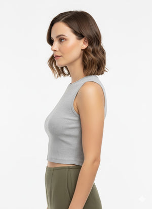 Meet your new wardrobe hero. This ultra-soft, heather grey ribbed tank features a flattering cropped fit and a classic high crew neck. It’s the absolute perfect base layer for any look, offering stretchy, all-day comfort and effortless style.