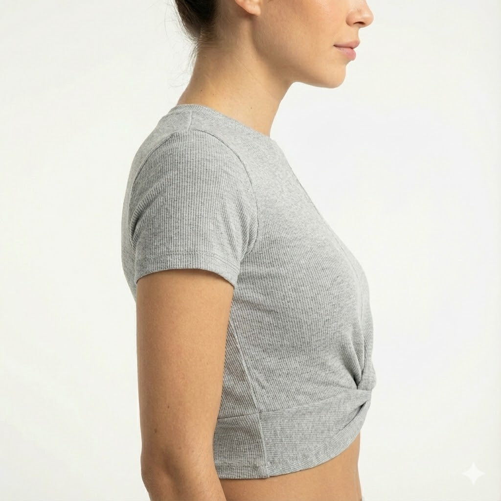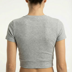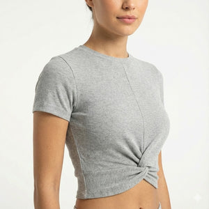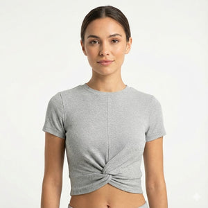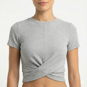 Elevate your everyday essentials with this chic heather grey crop top. Designed with a classic crew neckline and short sleeves, the standout feature is the elegant twist detailing at the front hem, adding a modern drape to a timeless silhouette. The fitted cut ensures a flattering look that isn't too tight.