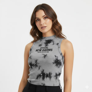 Level up your streetwear game with this edgy sleeveless crop. Featuring a grunge-inspired grey tie-dye wash and bold "New Garms" graphic, this top screams attitude. The stretchy ribbed knit and high neckline create a flattering silhouette that looks killer with cargo pants or leather trousers.