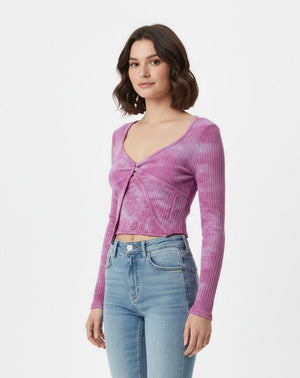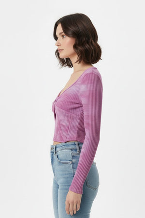 Style meets comfort in this stunning long sleeve crop top. The tie-dye pattern and twist detail create a bold yet feminine statement piece.