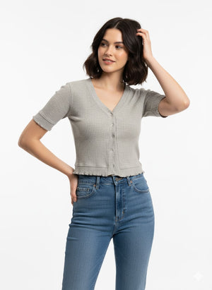 This versatile ribbed crop cardigan features a flattering V-neck, delicate ruffle trim on the sleeves and hem, and a functional button front. Wear it open or closed for a chic, adaptable look.