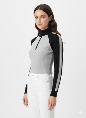 Channel ultimate sporty-chic vibes with this dynamic quarter-zip pullover. Featuring a slimming color-block design with black raglan sleeves and a grey bodice, this top is crafted from a stretchy ribbed knit that moves with you. The functional zipper allows you to adjust the neckline for a versatile look that transitions from gym-to-street effortlessly.