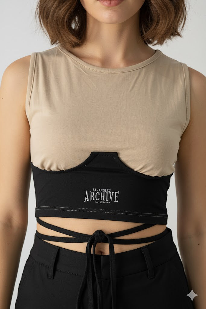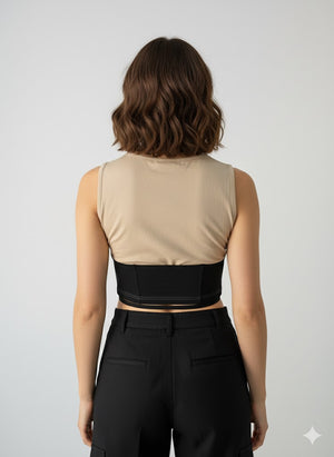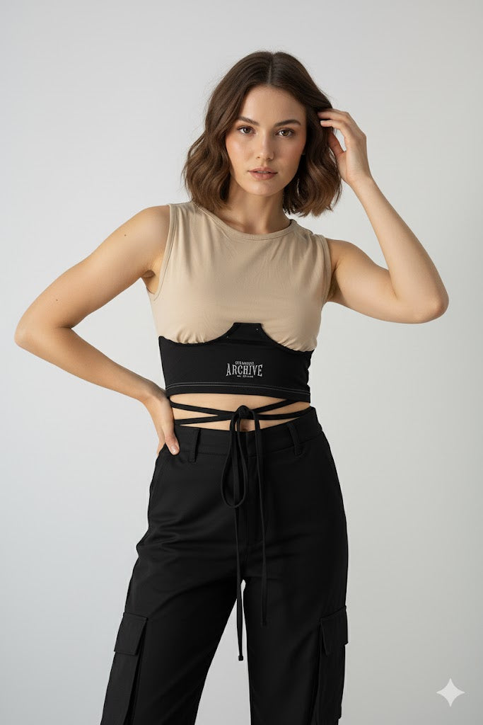 Merge utility-inspired style with feminine detail in this statement top. The combination of a soft beige tank with a structured black corset band creates a look that is both powerful and chic. Detailed with a cool graphic logo and long, flowing waist ties, it’s the ultimate piece for adding a modern, edgy twist to your wardrobe rotation.